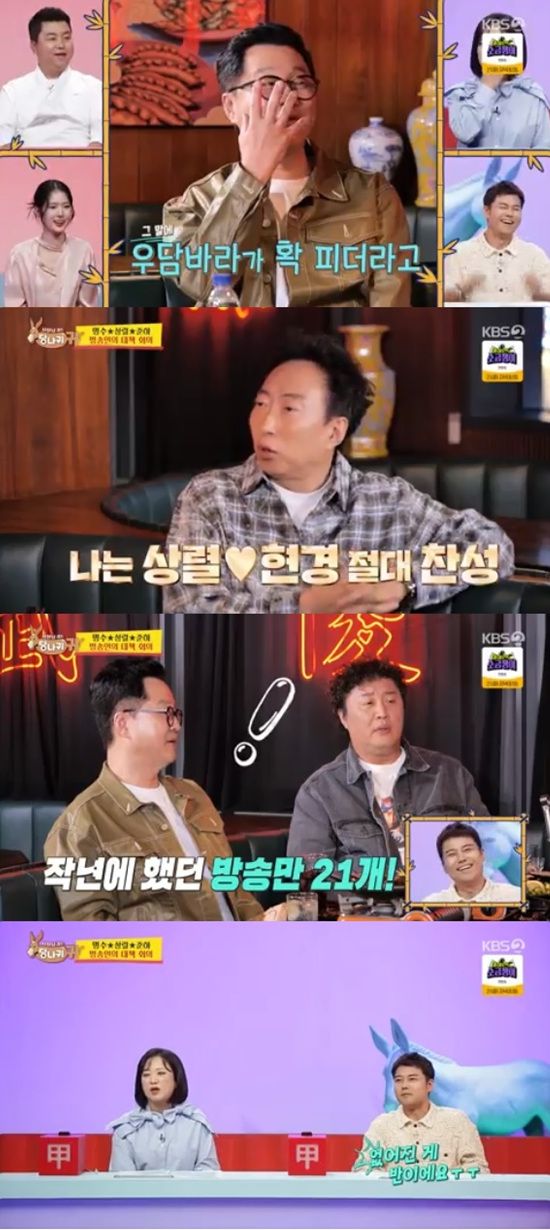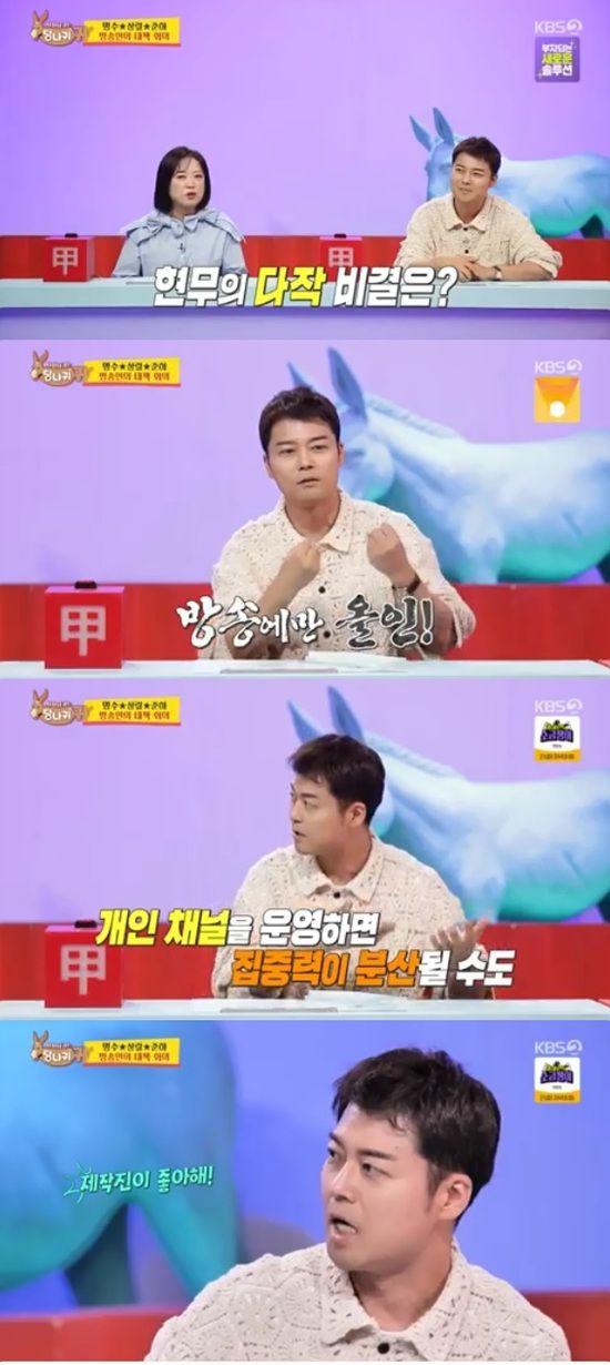 김숙은 전현무에게 다작의 비법을 물어봤다. 전현무는 "비결이 아니라 제가 생각을 해 봤다. 너튜브 안 하는 사람이 저밖에 없다. 방송에서 원하는 걸 다 해 줄 수 있다. 제작진이 좋아한다"고 전했다.