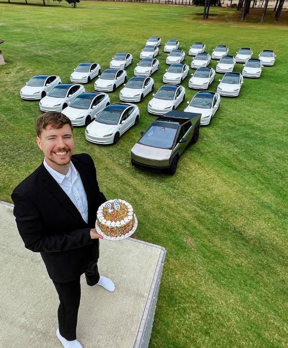 앞서 미스터 비스트는 "26번째 생일을 맞아 팔로워분들께 26대의 테슬라를 나눠드리려고 한다"며 "당첨자들은 25대의 테슬라 모델3 차량과 테슬라의 트럭형 모델인 '사이버 트럭' 1대를 선물받을 예정"이라고 밝혔다.