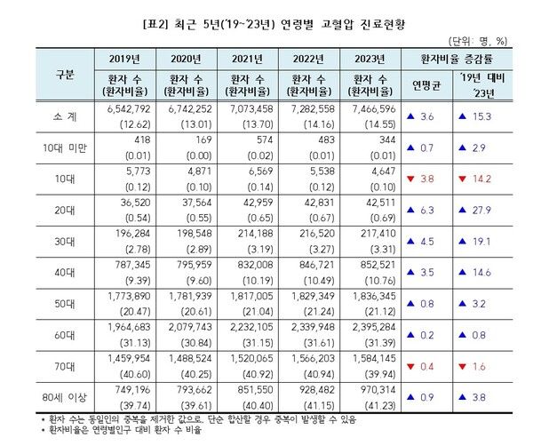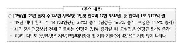 [내외일보] 건강보험심사평가원(원장 강중구, 이하 ‘심사평가원’)은 5월 17일‘세계 고혈압의 날’을 맞아 최근 5년간(′19~′23년) 고혈압 진료현황 결과를 발표했다.