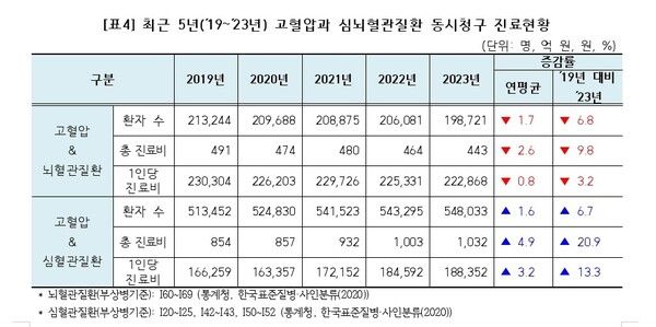 최근 5년 뇌혈관질환을 동반한 고혈압 환자 수는 ′19년 21만 3,244명 대비 ′23년 19만 8,721명으로 6.8%(연평균 1.7%) 감소한 반면, 심혈관질환을 동반한 고혈압 환자 수는 ′19년 51만 3,452명 대비 ′23년 54만 8,033명으로 6.7%(연평균 1.6%) 증가했다.
