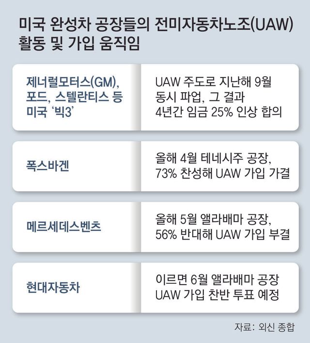 미 완성차 업계는 UAW의 다음 목표가 현대차 공장에 맞춰질 것으로 보고 있다. 미 현대차 공장에선 이르면 다음 달 노조 가입 투표가 진행될 것으로 전망된다. 2월 UAW는 현대차 앨라배마 공장 근로자 30% 이상이 노조 가입 카드에 서명했다고 밝혔다. 스티븐 실비아 아메리칸대 교수는 “UAW의 다음 목표는 현대차 공장과 미주리주 세인트루이스 외곽에 있는 도요타 공장이 될 것”이라고 말했다.