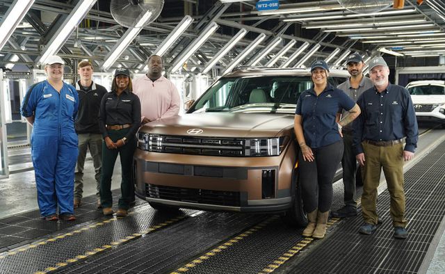 현대자동차의 미국 앨라베마 공장 근로자들이 생산 차량 옆에서 기념 촬영을 하고 있다. 4000여 명의 근로자가 근무하는 해당 공장에는 ‘투싼’과 ‘싼타페’ 등이 생산된다. 현대자동차 제공