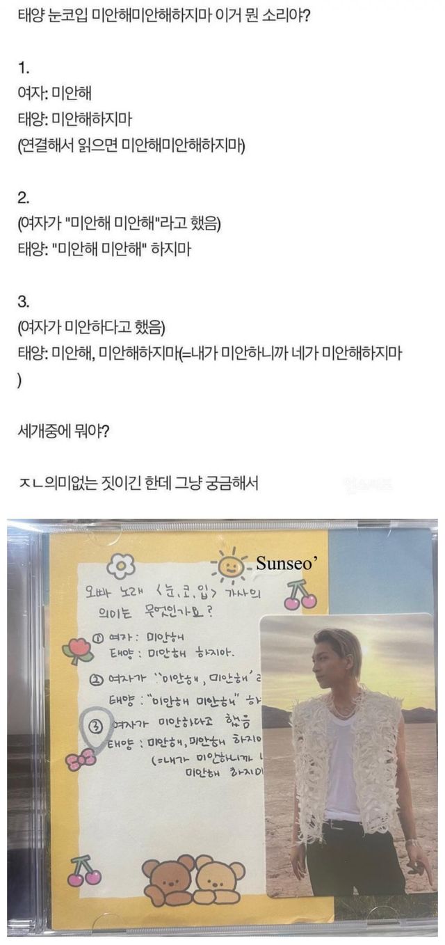 태양: (내가) 미안해, (너는) 미안해하지마 라고 함