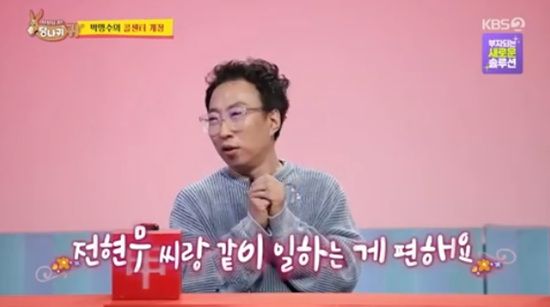 박명수는 "저는 전현무 씨, 재석 씨 다 친하다. 제가 뭘 하면 전현무 씨가 많이 웃어주신다. 전현무 씨랑 같이 일하는 게 편하다"고 전현무를 지목했다.