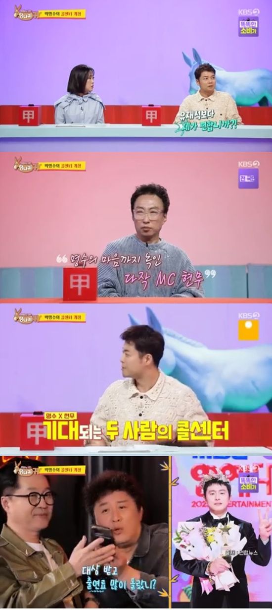 19일 방송된 KBS 2TV '사장님 귀는 당나귀 귀'에서는 박명수가 전현무와의 새 프로그램에 대한 희망을 드러내는 모습이 전파를 탔다.