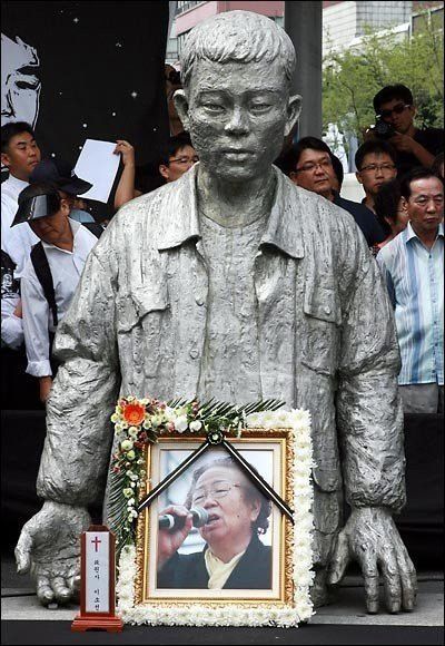 전태일 동상 앞에 놓인 이소선 여사 영정 사진(1929. 12. 30~2011. 9. 3)