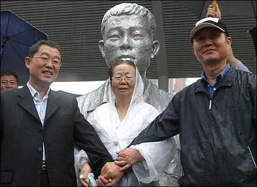 전태일 동상 매만지는 이소선여사