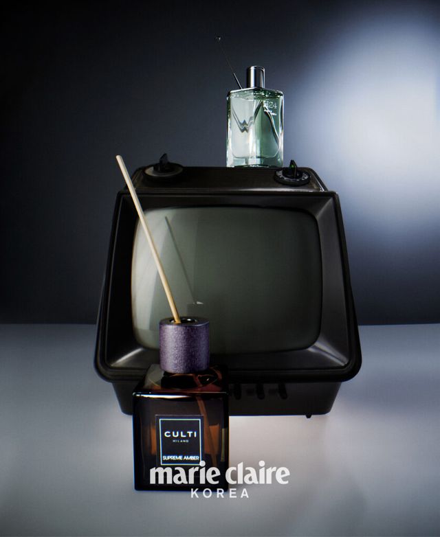 CULTI MILANO 데코르 클래식 디퓨저 #슈프림 앰버. 일몰에 착안해 탄생시킨 오리엔탈 계열의 향. 짙은 인센스 향과 농밀한 블랙 바닐라, 파촐리를 메인으로 우디 노트가 조화를 이룬다. 두꺼운 유리로 만든 사각형 병이 브라운관과 미묘하게 닮은꼴이다. 250ml, 11만9천원.