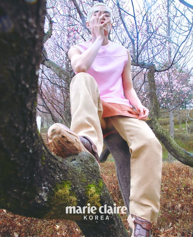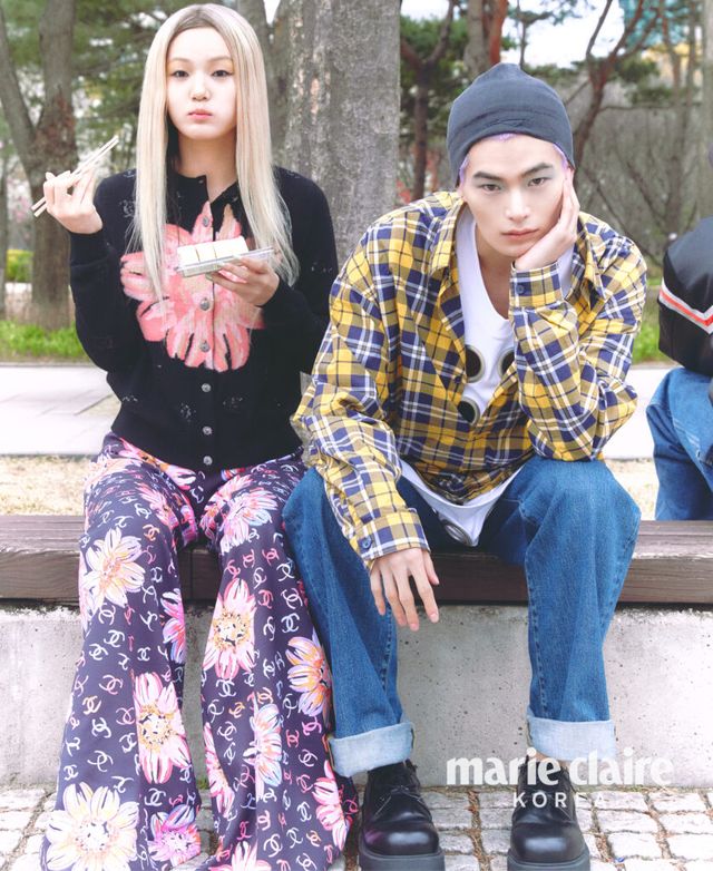 Chanel. 샤오가 입은 체크무늬 셔츠, 아일릿 장식 톱, 데님 트라우저, 더비 슈즈, 비니 모두 가격 미정