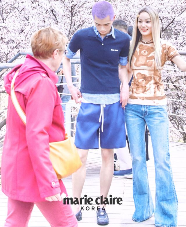Miu Miu. 소이가 입은 테디베어 패턴 톱 가격 미정, 플라워 모티프 네크리스 1백40만원 모두