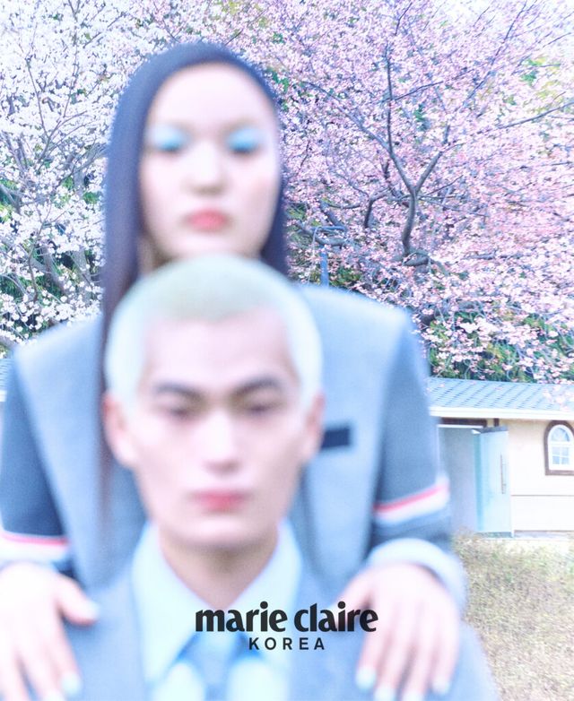 Miu Miu. 샤오가 입은 그레이 재킷과 팬츠, 셔츠, 타이 모두 가격 미정