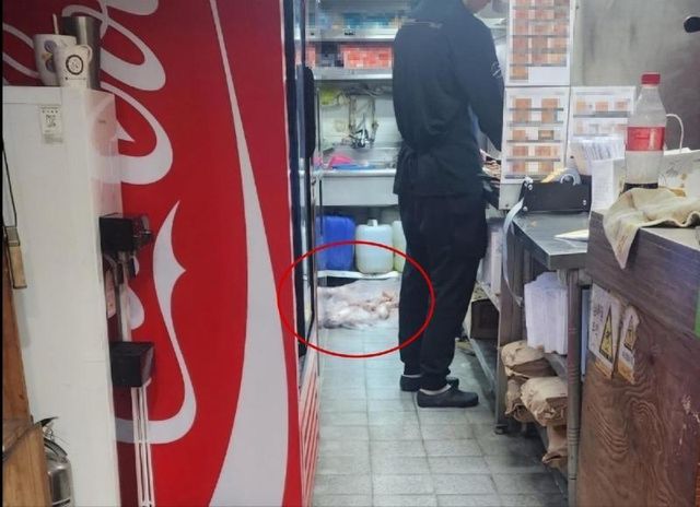 사진을 보면 좁은 주방에 각종 집기가 함께 널려 있었고 깨끗하지 않은 바닥에 생닭들이 놓여있었으며 바로 옆에서는 직원이 튀김 작업을 하고 있었다.