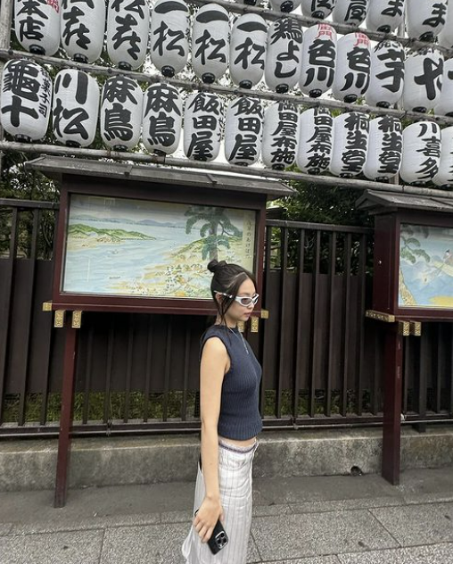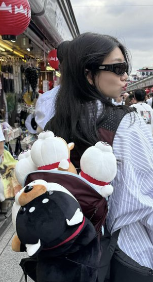 다른 사진에서는 일본 아사쿠사 길거리에서 영락없는 관광객 모드로 엉뚱함을 드러내기도 했다. 하늘색 스트라이프 셔츠를 입고 강아지 인형이 잔뜩 달린 배낭으로 눈길을 끌었다.