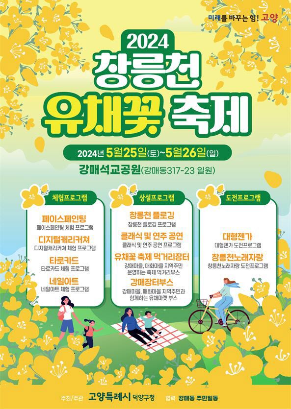 지역주민과 함께 조성한 유채꽃밭은 매년 규모를 넓혀 올해는 2만7000㎡에 만개한 유채꽃을 만나볼 수 있다. 창릉천노래자랑, 플로깅 등 참여형 프로그램은 예년보다 더 풍성해졌고 강매장터와 다양한 공연 등 다채로운 먹거리·볼거리도 가득하다.