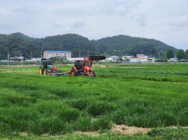 콩 후작으로 40ha 면적에 파종한 조사료는 지난 5월 초에 1차 수확을 완료하여 롤당 7만원에 전량 축산농가에 판매 완료하였으며, 5월 하순경 2차 수확할 계획이다.
