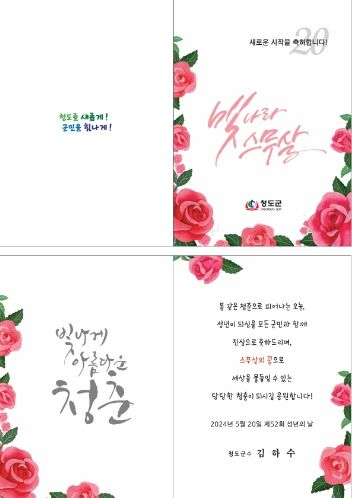 축하카드에는 ‘제52회 성년의 날을 맞이하여 봄 같은 청춘으로 피어나는 오늘, 성년이 되심을 모든 군민과 함께 진심으로 축하드리며, 스무살의 꿈으로 세상을 물들일 수 있는 당당한 청춘이 되시길 응원합니다.’라는 축하의 메시지가 담겨있다.