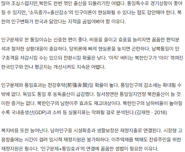 실제로 독일 역시 통일 후 동독 지역의 출산율이 떨어졌고, 심지어 북한 사람들의 건강수준, 영양수준상 이들이 통일 이후 제대로 된 노동력 역할을 할 수 있을지도 의문스러운 상황이라 실질적으로 통일이 오히려 인구유지에 해가 될 가능성도 있음.