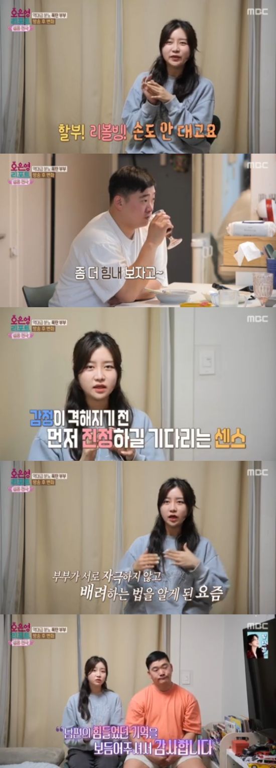 이어 아내는 "카드 할부, 리볼빙은 손도 안 대고 있다. 깨끗하게 정리를 했다"면서 웃었고, 남편은 "경제적인 부분을 거의 다 공유하고 있다"고 했다. 아내는 "서로 배려하는 법을 알게됐다. 서로 조심하려고 노력한다. 서로 기다려 줄 줄 알게됐다"면서 행복한 모습을 보였다.
