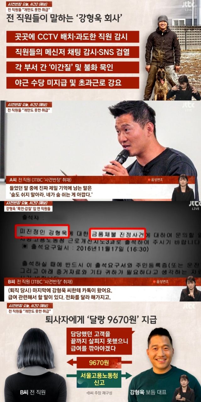 20일 방송된 JTBC ‘사건반장’은 최근 강형욱을 둘러싼 갑질 논란을 다뤘다. 제보에 나선 전 직원 A씨는 “제일 기억에 남는 말은 ‘숨도 쉬지 말아라, 네가 숨 쉬는 게 아깝다’”라며 강형욱의 폭언을 주장했다.