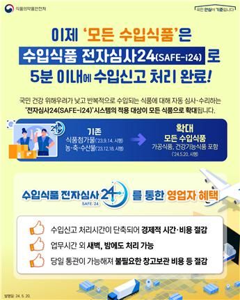 식품의약품안전처(처장 오유경)가 5월 20일부터 ‘전자심사24(SAFE-i24)’ 시스템의 적용 대상을 모든 수입식품으로 확대(기존 :식품첨가물, 농·축·수산물에만 적용)한다고 밝혔다.