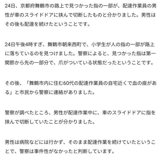 절단된 손가락은 손끝 첫마디 부분이었고 손톱도 그대로 붙어있었다고 함.