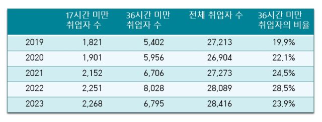 4월 고용동향에 따르면 36시간 미만 취업자는 전년 동월 대비 36만5000명(6.1%) 증가했고 36시간 이상 취업자는 9만4000명(-0.4%) 감소했다. 단시간 노동자의 증가는 단기적 추세가 아니라 최소 5년 전부터 통계로 확인되는 현상이다. 주당 평균 취업시간이 36시간 미만인 '단시간 취업자' 수는 2019년 540만2000명에서 2022년 802만8000명으로 늘어났고, 2023년에는 679만5000명으로 조금 줄어들었다. 전체 취업자 중 단시간 취업자의 비율도 2019년에는 19.9%였지만 2022년에는 28.5%에 달했다(2023년의 경우 23.9%로 감소). 17시간 미만 취업자도 2019년 182만1000명에서 2023년 226만8000명으로 부쩍 늘었다. 17시간 미만 취업자는 팬데믹 기간에 급격하게 늘어났는데, 팬데믹이 끝나고 나서도 그 수가 줄어들지 않고 오히려 더 늘어났다.
