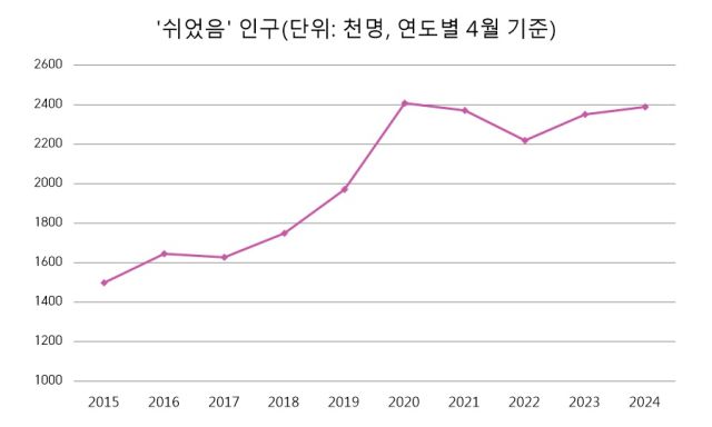 최근 1년간 실업률은 2.1%에서 3.2%로 낮은 수준을 유지하고 있다. 이론상 완전고용을 달성한 것이다. 그러나 서프라이즈하게 낮은 실업률이 동전의 앞면이라면 뒷면에는 '쉬었음' 인구의 증가라는 걱정스러운 현실이 새겨져 있다. '쉬었음' 인구는 비경제활동인구를 육아·가사·통학·기타로 분류할 때 기타에 해당하며, 질병 등 특별한 사유가 없는데도 무직으로 지내고 있지만 구직활동을 하지 않기 때문에 실업자로 분류되지도 않는 사람들이다. '쉬었음' 인구는 코로나 팬데믹을 기점으로 급증했다가 다시 내려오지 않고 유지되고 있다.