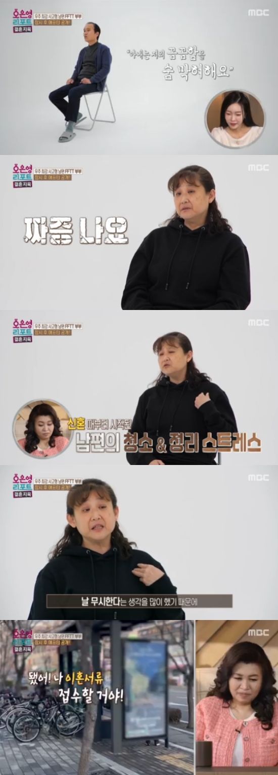 아내는 "짜증난다. 신혼 때 청소와 정리로 스트레스를 엄청 받았다. 그래서 남편이 청소를 하고 있으면 다 엎어버리고 싶다"면서 과거 청소 때문에 상처를 받았던 일화를 전하며 격한 감정을 드러냈다.