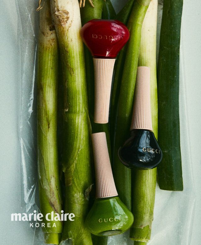 방금 시장에서 사 온 신선한 대파를 꺼내 그 위에 강렬한 레드와 세련된 블랙, 온화한 그린 컬러의 구찌 뷰티 베르니 아 옹글을 나란히 놓았다.