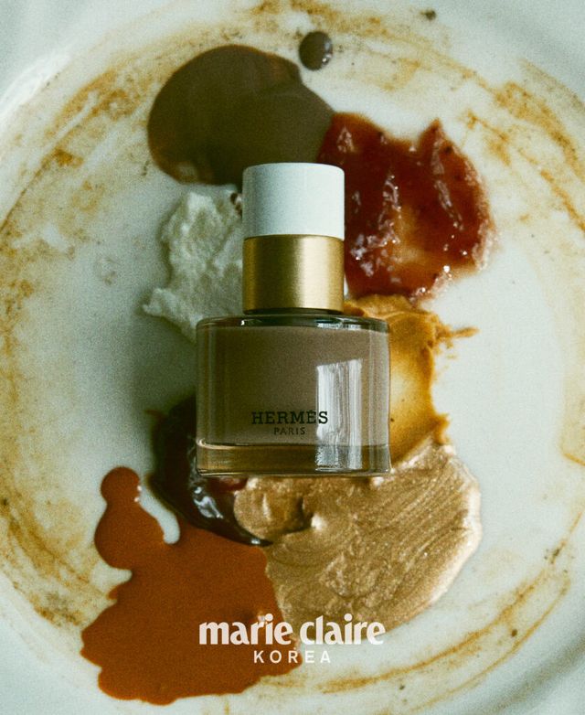 Hermès Beauty 레 맹 에르메스 네일 에나멜 #그리 에투프 80. 리넨의 베이지 색감을 구현해 차분한 톤의 매니큐어. 뭉치는 일 없이 얇고 매끄럽게 발려 덧바를수록 색의 깊이감을 더한다. 15ml, 6만9천원. 크림 세라믹 접시 1980년대 빈티지 제품 by Big Sleep.