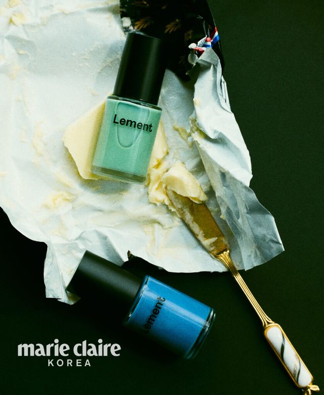 빵에 발라 먹고 남은 버터 조각이 꾸덕꾸덕하게 굳어 있다. 그 위에 르멘트 민트 그린 컬러와 빈티지 코발트블루 컬러 네일이 놓여 매력적인 컬러감을 안겨준다.