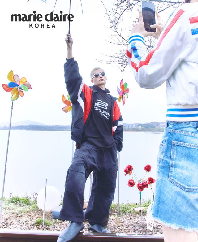 샤오가 입은 트랙 재킷, 후디, 오버사이즈 카고 팬츠, 뮬 모두 가격 미정