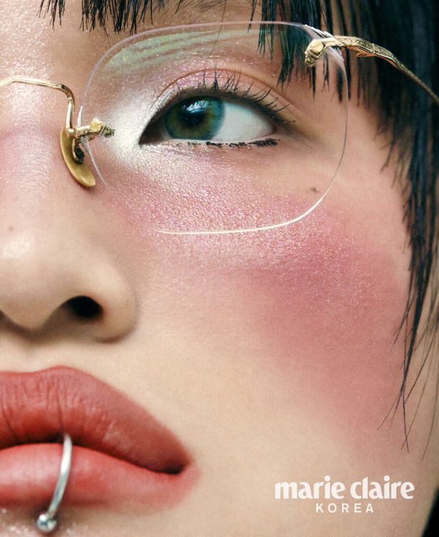 콧날 양옆과 입술 아래 페이크 피어싱을 붙여 쿨한 무드를 가미한 긱 시크 룩. 은은한 반짝임을 더하는