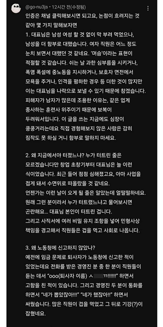 A 씨는 직원들이 노동청에 강형욱을 신고하지 않은 이유도 있다고 했다. 그는 “임금 문제로 퇴사자가 노동청에 신고한 적이 있었는데 전화를 받은 경영진 중 한 명이 직원들이 듣는 데서 퇴사자 실명을 거론하며 쌍욕을 뱉으며 고함을 친 적이 있다. 그리고 경영진 둘이 통화를 하면서 ‘네가 뽑았잖아’ ‘네가 했잖아’라고 말하며 싸운 적이 있다. (당시 일로) 많은 직원이 겁을 먹었고 그 뒤로 기강(?)이 잡혔다”고 말했다.