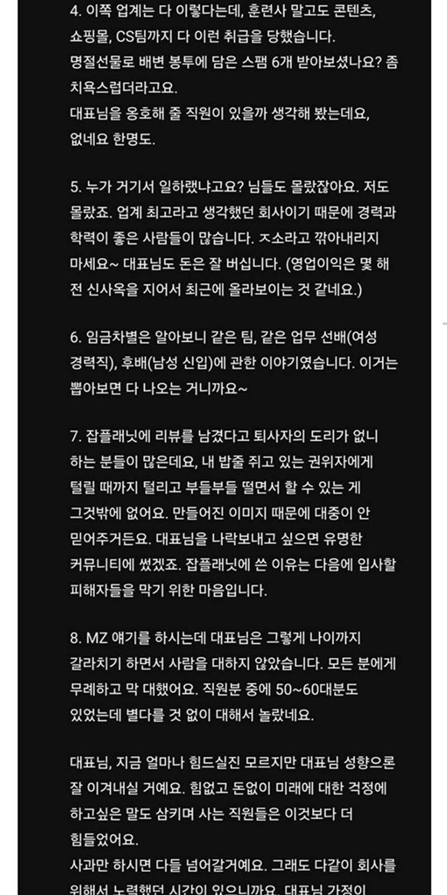 A 씨는 콘텐츠 담당자, 쇼핑몰 담당자, CS 팀원들도 반려견 훈련사와 같은 취급을 당했다고 했다. 그는 “명절선물로 배변 봉투에 담은 스팸 6개를 받았다. 좀 치욕스럽더라”라면서 “대표님을 옹호해 줄 직원이 있을까 생각해 봤는데 한 명도 없더라”라고 말했다.