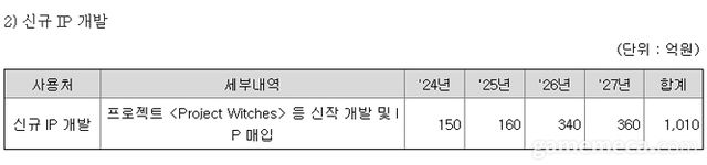 ▲ 프로젝트 위치스 등 신작 개발 및 IP 매입 자금 사용 계획 (자료출처: 전자공시)