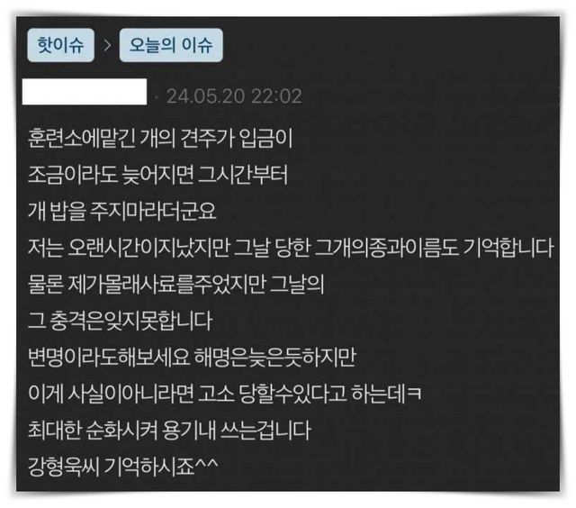 해당 댓글 작성자는 "훈련소에 맡긴 개의 견주가 입금이 조금이라도 늦어지면 그 시간부터 개 밥을 주지 마라더라" "저는 오래 시간 지났지만 그날 당한 그 개의 종과 이름도 기억한다" "물론 제가 몰래 사료를 주었지만 그날의 그 충격은 잊지 못한다" "변명이라도 해보셔라. 해명은 늦은 듯하지만" '이게 사실이 아니라면 고소당할 수 있다고 하는데 ㅋ 최대한 순화시켜 용기 내 쓰는 것" '강형욱 씨 기억하시죠^^" 등의 주장을 남겼다.