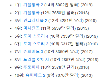 극장 애니메이션 역대 월드 박스 오피스 성적