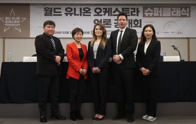 고필규 두미르 대표(왼쪽부터), 유소방 sbu 대표, 미쉘 김 콘서트마스터, 로렌츠 아이히너 지휘자가 지난달 27일 서울 중구 프레스센터에서 열린 '월드 유니온 오케스트라 슈퍼클래식' 언론공개회에서 포즈를 취하고 있다./연합뉴스