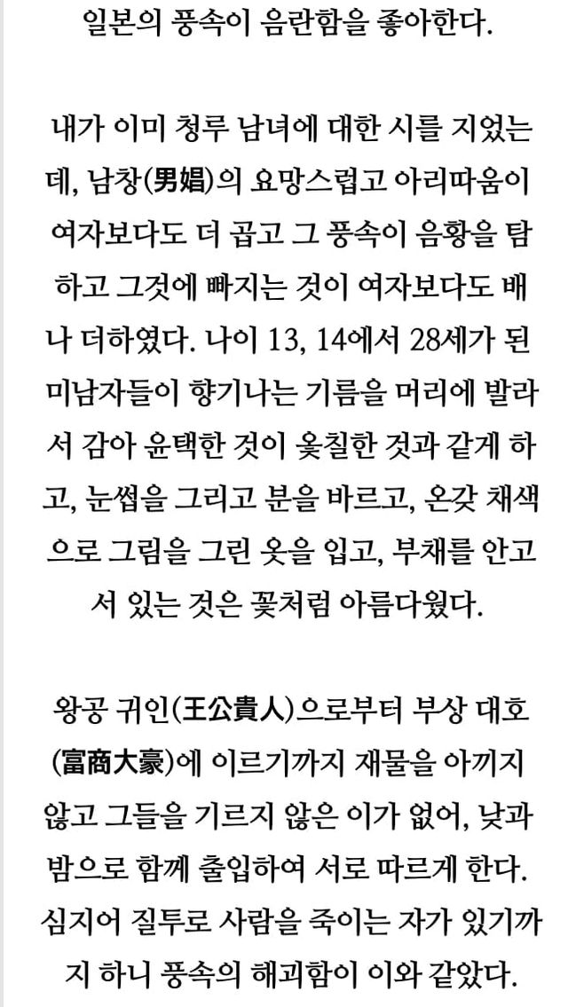 'ํด์ ๋ก'์์ ๊ทธ๋ "(์ผ๋ณธ์) ๋จ์ฐฝ์ ์๋ง์ค๋ฝ๊ณ ์๋ฆฌ๋ฐ์์ด ์ฌ์๋ณด๋ค๋ ๊ณฑ๋ค. ๊ทธ ํ์์ด ์ํํ๊ณ ์ด์ ๋น ์ง๋ ๊ฒ์ด ์ฌ์๋ณด๋ค ๋ฐฐ๋ ๋ํ์๋ค"๋ผ๋ฉฐ ์ผ๋ณธ์ ๋จ์ฐฝ ๋ฌธํ๋ฅผ ๋ฌ์ฌํ๋ค.