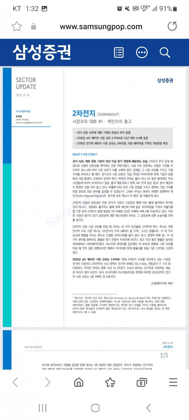 삼성증권의 2차전지 관련 레포트 첫줄