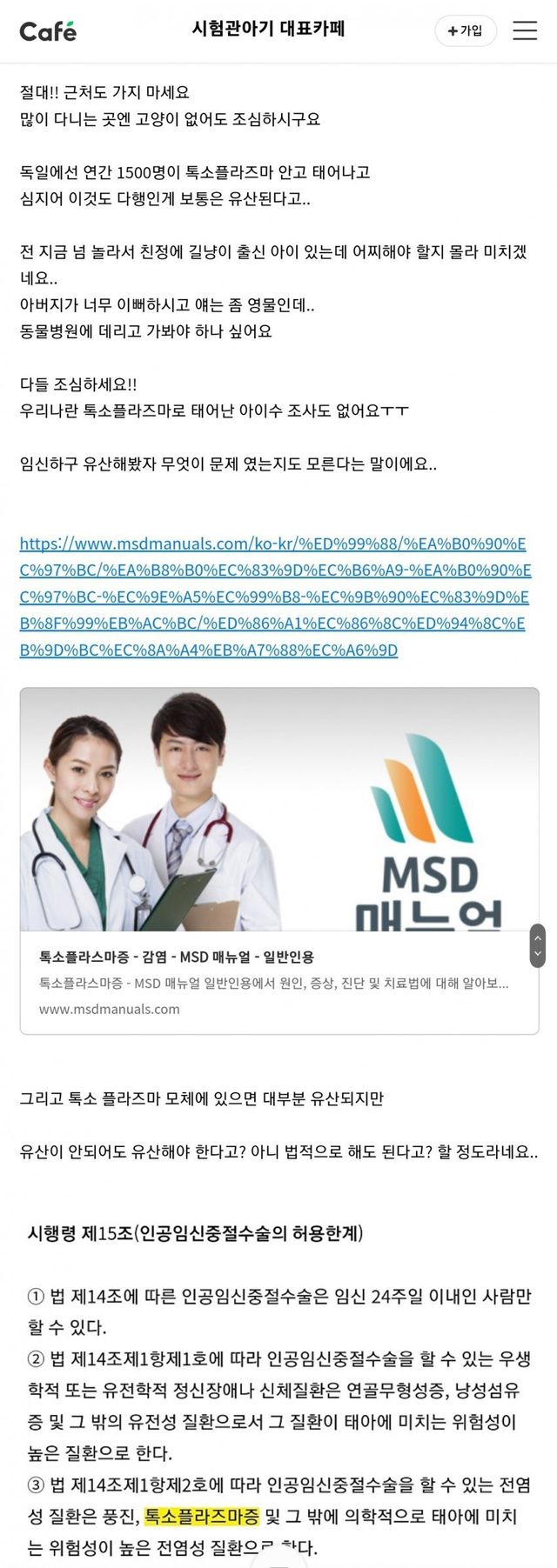 1. 네이버 시험관아기, 난임 관련 카페에 톡소플라즈마는 난임과 유산 기형아 확률 50프로라 고양이 만지면 안된다고 글 올라옴