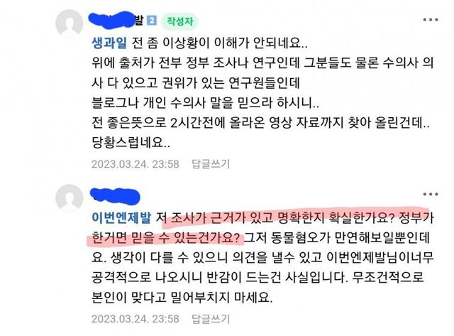 3.정부기관과 수의학계에서 조사한 글과 논문을 제시해도 무작정 우기고 혐오글이라며 지우라 협박. + 카페운영진에게 삭제요청