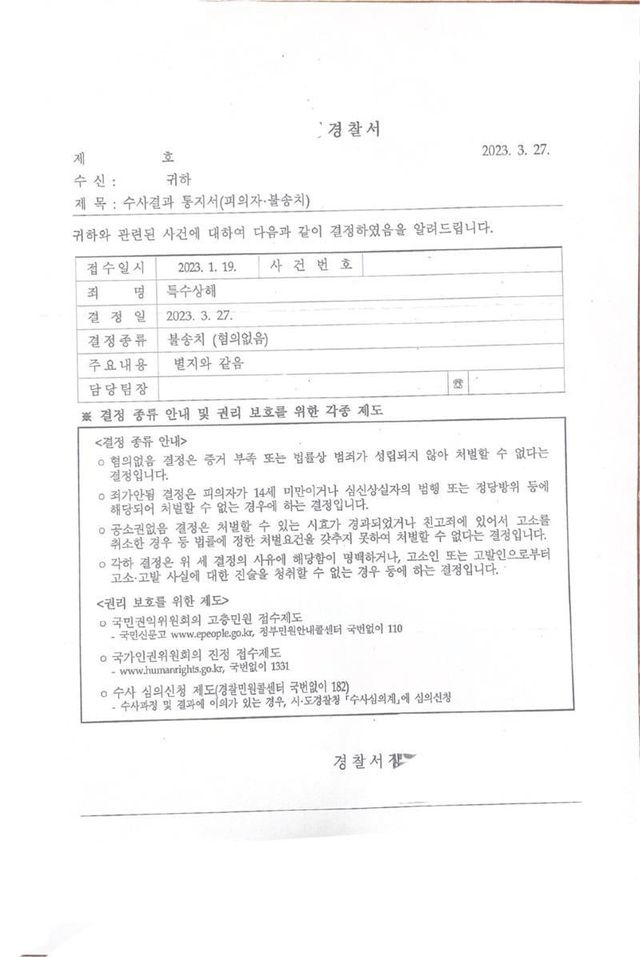 후에 증거불충분, 혐의 없음으로 불송치 판결이 났고 저는 이 상황이 끝날 거라고 생각했습니다.