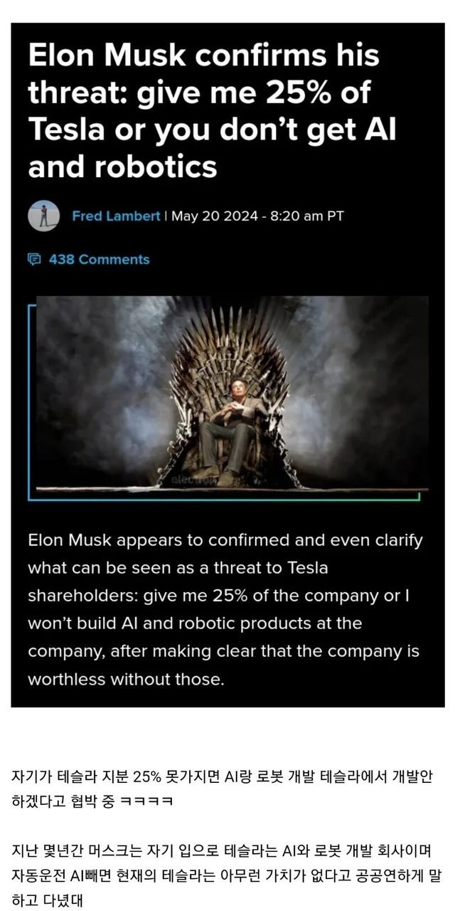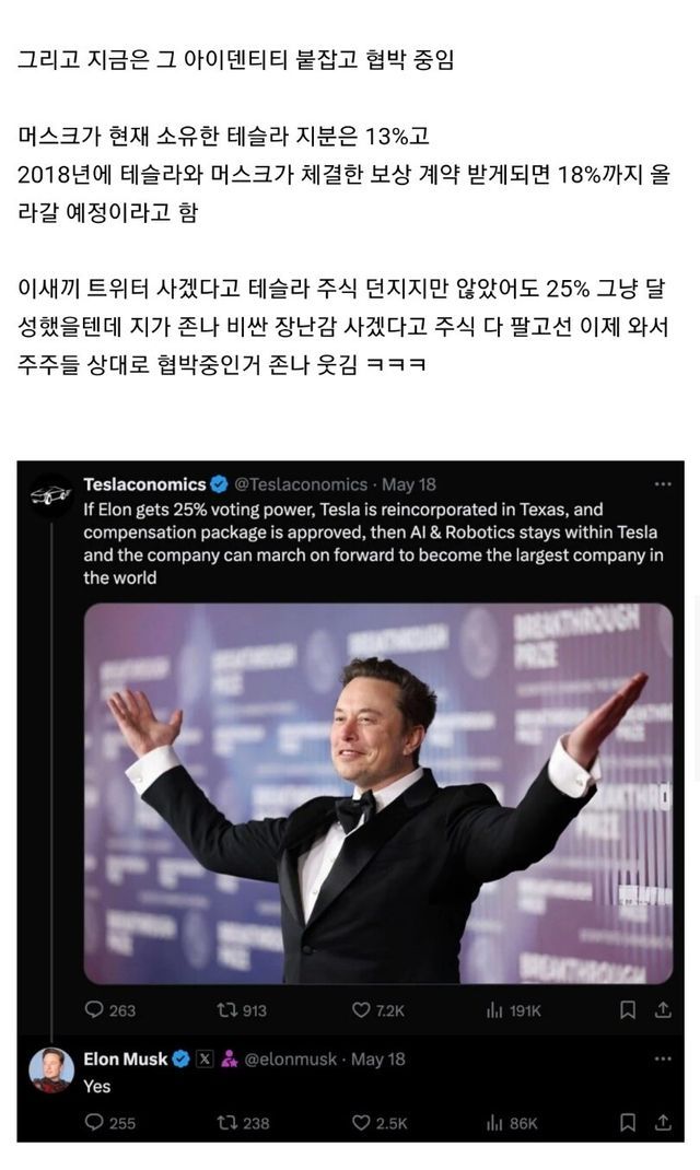 18년도에 체결한 보상계약안은 한 테슬라 소액주주에 의해서 저지되었고 머스크는 본사 법인 소재지를 옮겨서 항소 하려고 했지만 그 소액주주에게 다시 또 격추 당해서 계속 생때 부리는중