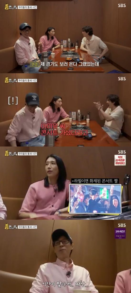유재석은 "연석이 공연 한 번 봐봐라. 진짜 멋있다. 나도 가서 봤다"고 했고, 이 말에 김연경은 "제 경기를 보러 온다고 그러더니, 아이유 씨 콘서트를 가셨더라. 정장 입은 짤이 엄청 이슈가 되지 않았냐. '뭐야' 싶었다. 저한테는 문자만 보냈었다"고 서운해했다.