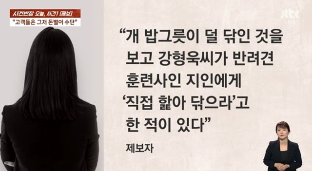 다른 제보자는 "개 밥그릇이 덜 닦인 것을 보고 강형욱 씨가 반려견 훈련사인 지인에게 '직접 핥아 닦으라'고 한 적이 있다"라고 주장해 충격을 자아내기도 했다.