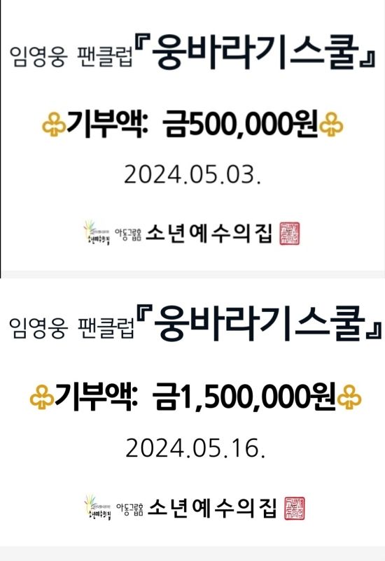 임영웅 팬클럽 '웅바라기스쿨'은 5월 가정의 달을 맞이해 200만 원(50만 원과 150만 원)을 아동‧청소년 보호 시설인 송파구 소년 예수의 집에 전달했다고 밝혔다.