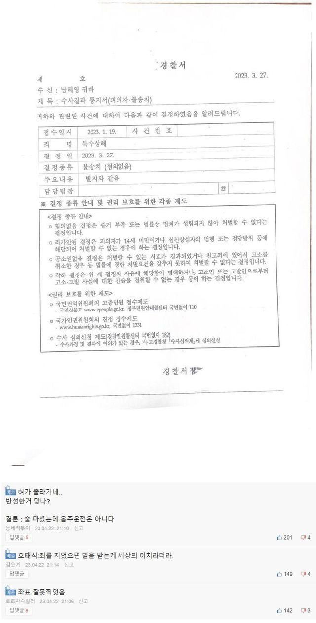 후에 증거불충분, 혐의 없음으로 불송치 판결이 났고 저는 이 상황이 끝날 거라고 생각했습니다.