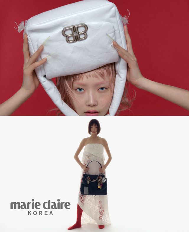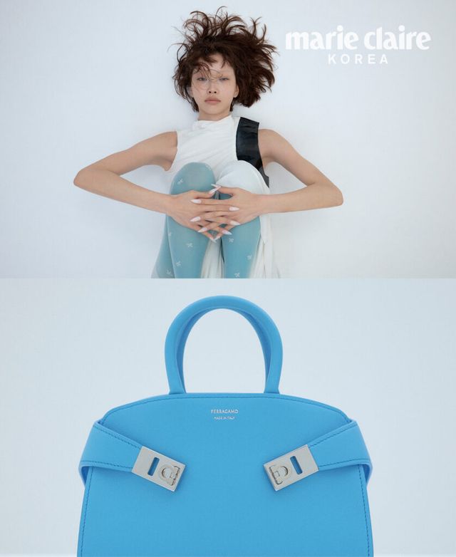 기하학적 패턴의 톱과 스커트, 유려한 실루엣이 돋보이는 허그 미니 백 모두 가격 미정